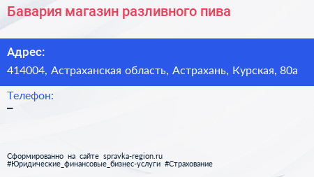Бавария, магазин разливного пива по адресу 414004, Астраханская область, Астрахань, Курская, 80а в дальнейшем Организация, размещена в следующих категориях: