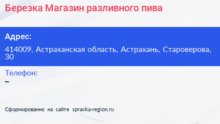 Березка, Магазин разливного пива по адресу 414009, Астраханская область, Астрахань, Староверова, 30 в дальнейшем Организация, размещена в следующих категориях: