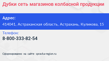 Дубки, сеть магазинов колбасной продукции по адресу 414041, Астраханская область, Астрахань, Куликова, 15 в дальнейшем Организация, размещена в следующих категориях: