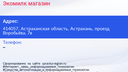 Экомилк, магазин по адресу 414057, Астраханская область, Астрахань, проезд Воробьёва, 7в в дальнейшем Организация, размещена в следующих категориях:
