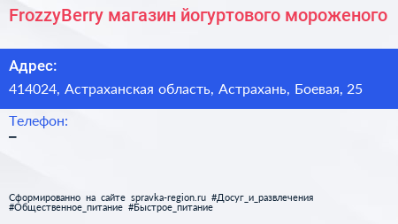 FrozzyBerry, магазин йогуртового мороженого по адресу 414024, Астраханская область, Астрахань, Боевая, 25 в дальнейшем Организация, размещена в следующих категориях: