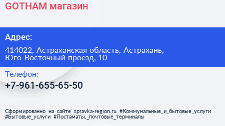 GOTHAM, магазин по адресу 414022, Астраханская область, Астрахань, Юго-Восточный проезд, 10 в дальнейшем Организация, размещена в следующих категориях: