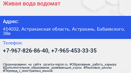Живая вода, водомат по адресу 414032, Астраханская область, Астрахань, Бабаевского, 38в в дальнейшем Организация, размещена в следующих категориях: