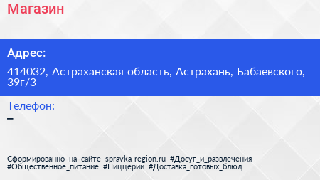 Магазин по адресу 414032, Астраханская область, Астрахань, Бабаевского, 39г/3 в дальнейшем Организация, размещена в следующих категориях: