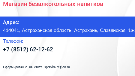 Магазин безалкогольных напитков по адресу 414041, Астраханская область, Астрахань, Славянская, 1ж в дальнейшем Организация, размещена в следующих категориях: