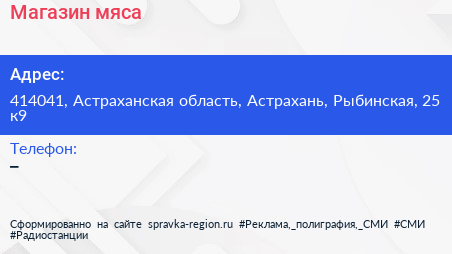 Магазин мяса по адресу 414041, Астраханская область, Астрахань, Рыбинская, 25 к9 в дальнейшем Организация, размещена в следующих категориях: