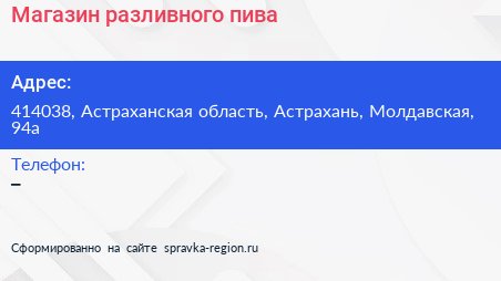 Магазин разливного пива по адресу 414038, Астраханская область, Астрахань, Молдавская, 94а в дальнейшем Организация, размещена в следующих категориях: