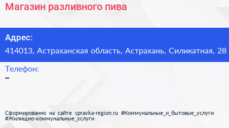 Магазин разливного пива по адресу 414013, Астраханская область, Астрахань, Силикатная, 28 в дальнейшем Организация, размещена в следующих категориях: