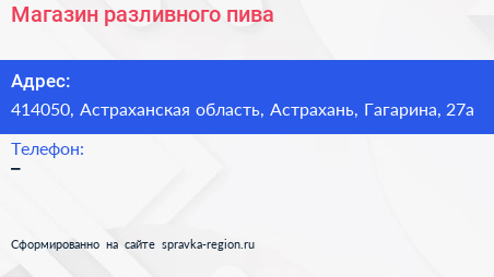 Магазин разливного пива по адресу 414050, Астраханская область, Астрахань, Гагарина, 27а в дальнейшем Организация, размещена в следующих категориях: