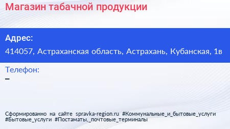 Магазин табачной продукции по адресу 414057, Астраханская область, Астрахань, Кубанская, 1в в дальнейшем Организация, размещена в следующих категориях: