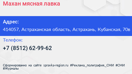 Махан, мясная лавка по адресу 414057, Астраханская область, Астрахань, Кубанская, 70в в дальнейшем Организация, размещена в следующих категориях: