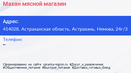 Махан, мясной магазин по адресу 414028, Астраханская область, Астрахань, Немова, 24г/3 в дальнейшем Организация, размещена в следующих категориях:
