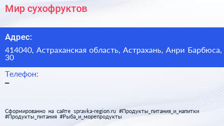 Мир сухофруктов по адресу 414040, Астраханская область, Астрахань, Анри Барбюса, 30 в дальнейшем Организация, размещена в следующих категориях: