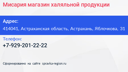Мисария, магазин халяльной продукции по адресу 414041, Астраханская область, Астрахань, Яблочкова, 31 в дальнейшем Организация, размещена в следующих категориях:
