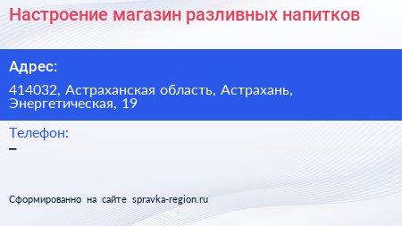 Настроение, магазин разливных напитков по адресу 414032, Астраханская область, Астрахань, Энергетическая, 19 в дальнейшем Организация, размещена в следующих категориях: