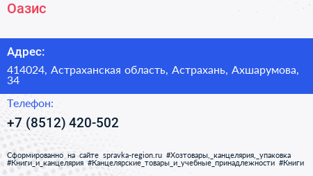 Оазис+ по адресу 414024, Астраханская область, Астрахань, Ахшарумова, 34 в дальнейшем Организация, размещена в следующих категориях:
