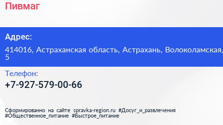 Пивмаг по адресу 414016, Астраханская область, Астрахань, Волоколамская, 5 в дальнейшем Организация, размещена в следующих категориях:
