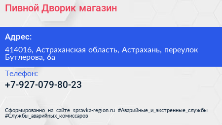 Пивной Дворик, магазин по адресу 414016, Астраханская область, Астрахань, переулок Бутлерова, 6а в дальнейшем Организация, размещена в следующих категориях: