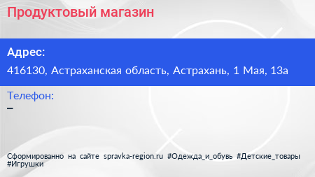 Продуктовый магазин по адресу 416130, Астраханская область, Астрахань, 1 Мая, 13а в дальнейшем Организация, размещена в следующих категориях: