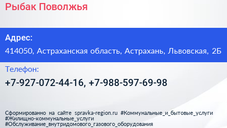 Рыбак Поволжья по адресу 414050, Астраханская область, Астрахань, Львовская, 2Б в дальнейшем Организация, размещена в следующих категориях: