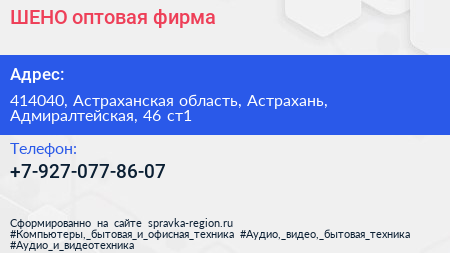ШЕНО, оптовая фирма по адресу 414040, Астраханская область, Астрахань, Адмиралтейская, 46 ст1 в дальнейшем Организация, размещена в следующих категориях: