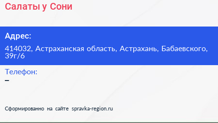 Салаты у Сони по адресу 414032, Астраханская область, Астрахань, Бабаевского, 39г/6 в дальнейшем Организация, размещена в следующих категориях: