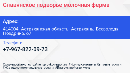 Славянское подворье, молочная ферма по адресу 414004, Астраханская область, Астрахань, Всеволода Ноздрина, 67 в дальнейшем Организация, размещена в следующих категориях: