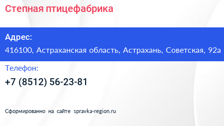 Степная, птицефабрика по адресу 416100, Астраханская область, Астрахань, Советская, 92а в дальнейшем Организация, размещена в следующих категориях: