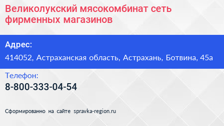 Великолукский мясокомбинат, сеть фирменных магазинов по адресу 414052, Астраханская область, Астрахань, Ботвина, 45а в дальнейшем Организация, размещена в следующих категориях: