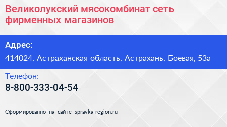 Великолукский мясокомбинат, сеть фирменных магазинов по адресу 414024, Астраханская область, Астрахань, Боевая, 53а в дальнейшем Организация, размещена в следующих категориях: