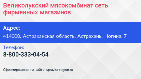 Великолукский мясокомбинат, сеть фирменных магазинов по адресу 414000, Астраханская область, Астрахань, Ногина, 7 в дальнейшем Организация, размещена в следующих категориях:
