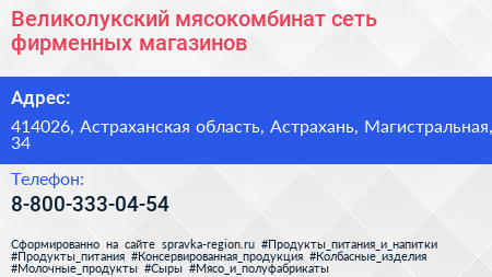 Великолукский мясокомбинат, сеть фирменных магазинов по адресу 414026, Астраханская область, Астрахань, Магистральная, 34 в дальнейшем Организация, размещена в следующих категориях: