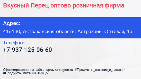 Вкусный Перец, оптово-розничная фирма по адресу 416130, Астраханская область, Астрахань, Оптовая, 1а в дальнейшем Организация, размещена в следующих категориях: