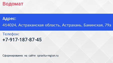 Водомат по адресу 414024, Астраханская область, Астрахань, Бакинская, 79а в дальнейшем Организация, размещена в следующих категориях:
