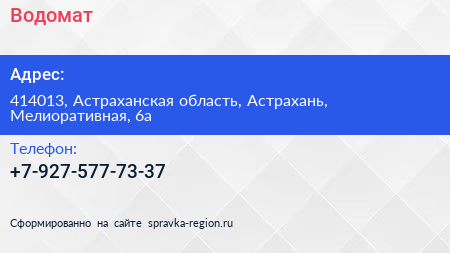 Водомат по адресу 414013, Астраханская область, Астрахань, Мелиоративная, 6а в дальнейшем Организация, размещена в следующих категориях: