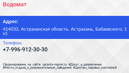 Водомат по адресу 414032, Астраханская область, Астрахань, Бабаевского, 1 к1 в дальнейшем Организация, размещена в следующих категориях: