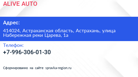 ALIVE-AUTO по адресу 414024, Астраханская область, Астрахань, улица Набережная реки Царева, 1а в дальнейшем Организация, размещена в следующих категориях: