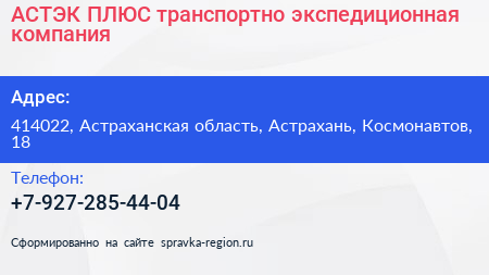 АСТЭК ПЛЮС, транспортно-экспедиционная компания по адресу 414022, Астраханская область, Астрахань, Космонавтов, 18 в дальнейшем Организация, размещена в следующих категориях: