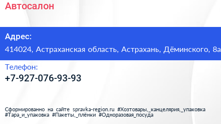 Автосалон по адресу 414024, Астраханская область, Астрахань, Дёминского, 8а в дальнейшем Организация, размещена в следующих категориях: