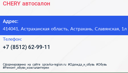 CHERY, автосалон по адресу 414041, Астраханская область, Астрахань, Славянская, 1л в дальнейшем Организация, размещена в следующих категориях: