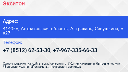 Экситон по адресу 414056, Астраханская область, Астрахань, Савушкина, 6 к27 в дальнейшем Организация, размещена в следующих категориях: