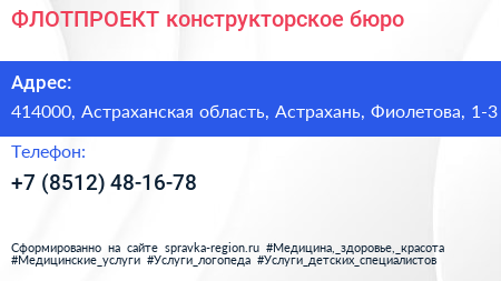ФЛОТПРОЕКТ, конструкторское бюро по адресу 414000, Астраханская область, Астрахань, Фиолетова, 1-3 в дальнейшем Организация, размещена в следующих категориях: