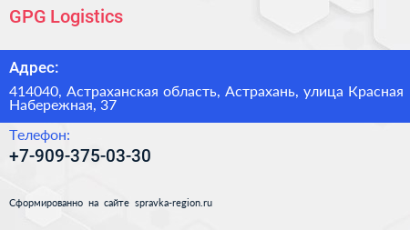 GPG Logistics по адресу 414040, Астраханская область, Астрахань, улица Красная Набережная, 37 в дальнейшем Организация, размещена в следующих категориях: