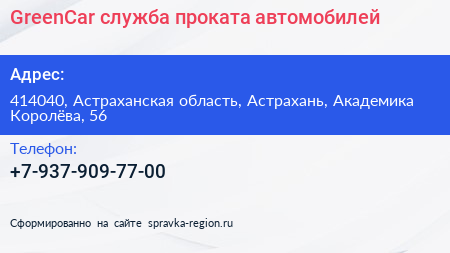 GreenCar, служба проката автомобилей по адресу 414040, Астраханская область, Астрахань, Академика Королёва, 56 в дальнейшем Организация, размещена в следующих категориях:
