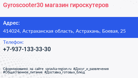 Gyroscooter30, магазин гироскутеров по адресу 414024, Астраханская область, Астрахань, Боевая, 25 в дальнейшем Организация, размещена в следующих категориях: