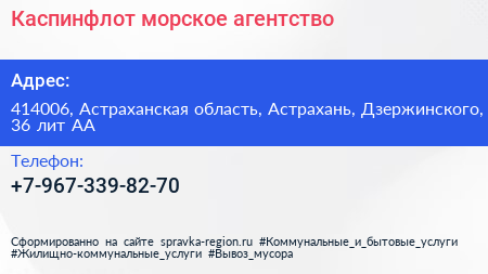 Каспинфлот, морское агентство по адресу 414006, Астраханская область, Астрахань, Дзержинского, 36 лит АА в дальнейшем Организация, размещена в следующих категориях: