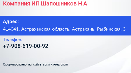 Компания, ИП Шапошников Н.А. по адресу 414041, Астраханская область, Астрахань, Рыбинская, 3 в дальнейшем Организация, размещена в следующих категориях: