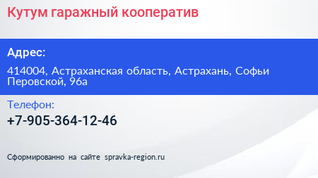 Кутум, гаражный кооператив по адресу 414004, Астраханская область, Астрахань, Софьи Перовской, 96а в дальнейшем Организация, размещена в следующих категориях:
