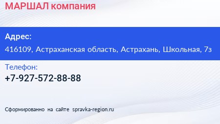 МАРШАЛ, компания по адресу 416109, Астраханская область, Астрахань, Школьная, 7з в дальнейшем Организация, размещена в следующих категориях: