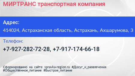 МИРТРАНС, транспортная компания по адресу 414024, Астраханская область, Астрахань, Ахшарумова, 3 в дальнейшем Организация, размещена в следующих категориях: